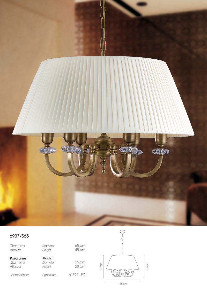 Collezione in ottone con cristalli molati trasparenti e paralumi nastrati nei colori: Avorio Bianco.