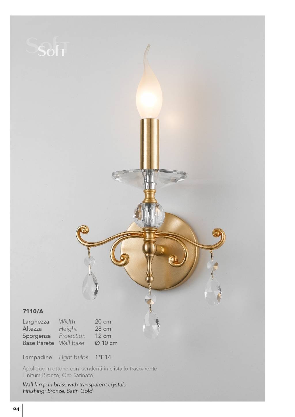 Wall lamp in brass with transparent crystals
